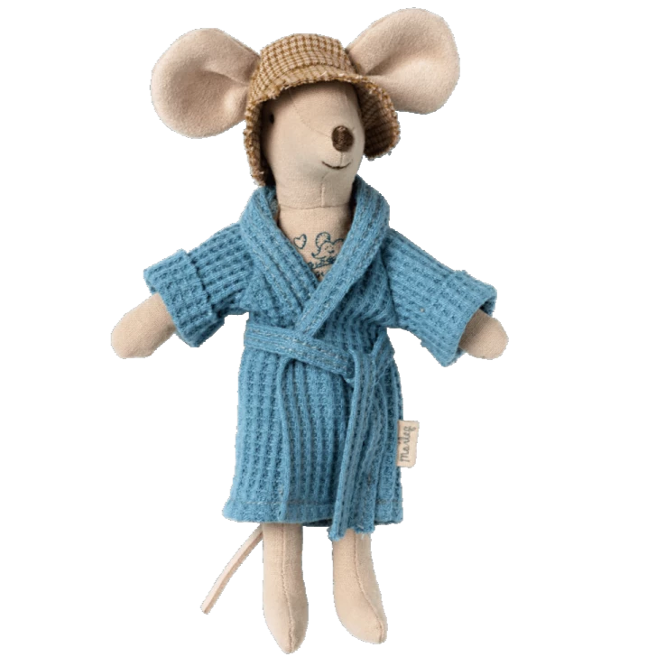 Accappatoio Dusty Blue Topolino Papà E’ giunto il momento delle vacanze anche per i topolini! Dettagli: materiale: cotone e poliestere NB: topolini non inclusi marca: Maileg