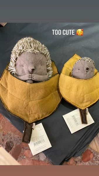 HEDGEHOG IN LEAF The hedgehog sleeps safely in its leaf. Product details Item number : 16-0931-00 Height : 18 cm Age: All ages Washing instruction: 30 degrees Material: Acrylic/Linen/Polyester
