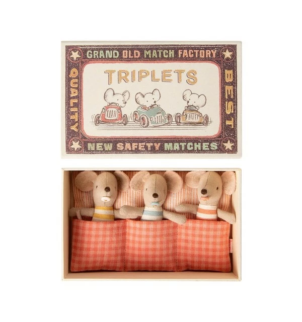 Now you can have 3 baby mice at the same time. The triplet baby mice are carefully tugged in their matchbox bed in the warm sleeping bag. They all have their own passifier and sleeps tight side by side. Height: baby 8 cm. Material: Cotton.