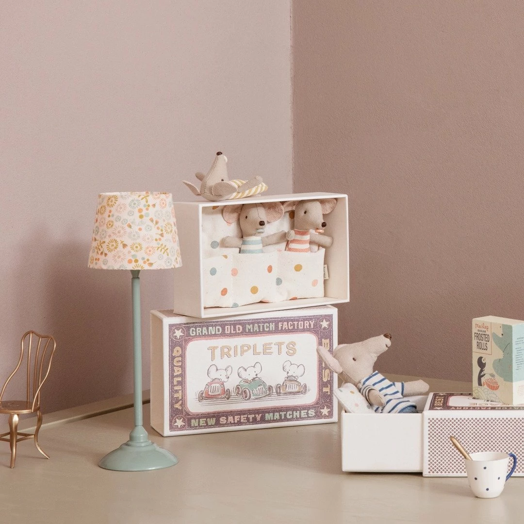 Now you can have 3 baby mice at the same time. The triplet baby mice from Maileg are carefully tugged into their matchbox bed in a warm sleeping bag. They all have their own pacifier and sleeps tight side by side. Size: Baby mouse Height: 8 cm Age: All ages Washing instruction: 30 degrees Material: Cotton / Linen