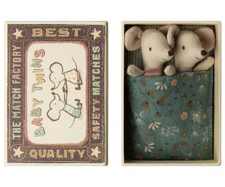 Maileg is a multi award-winning Danish design company which makes unique quality, long-lasting, charming products, which merge modern Scandinavian design with storybook whimsy and meticulous attention to detail. Maileg offers a world where matchboxes are beds for mice, adored by both adults and children, cherished and often passed on from generation to generation. They make a wonderful gift. The Baby Twins are lying nicely in their sleeping bag and come in the popular decorated handmade matchbox – let their imagination run wild! Founded in 1999, Maileg is a Danish toy brand founded by illustrator and designer Dorthe Mailil. Known for their imaginative, playful toy designs that range from mice in matchboxes, to giant bunnies, alongside all the accessories and clothing to dress up her creations. The designs skilfully blend the Scandinavian aesthetic with the tradition of animal soft toys, making Maileg so popular amongst children and their parents. Brand Maileg