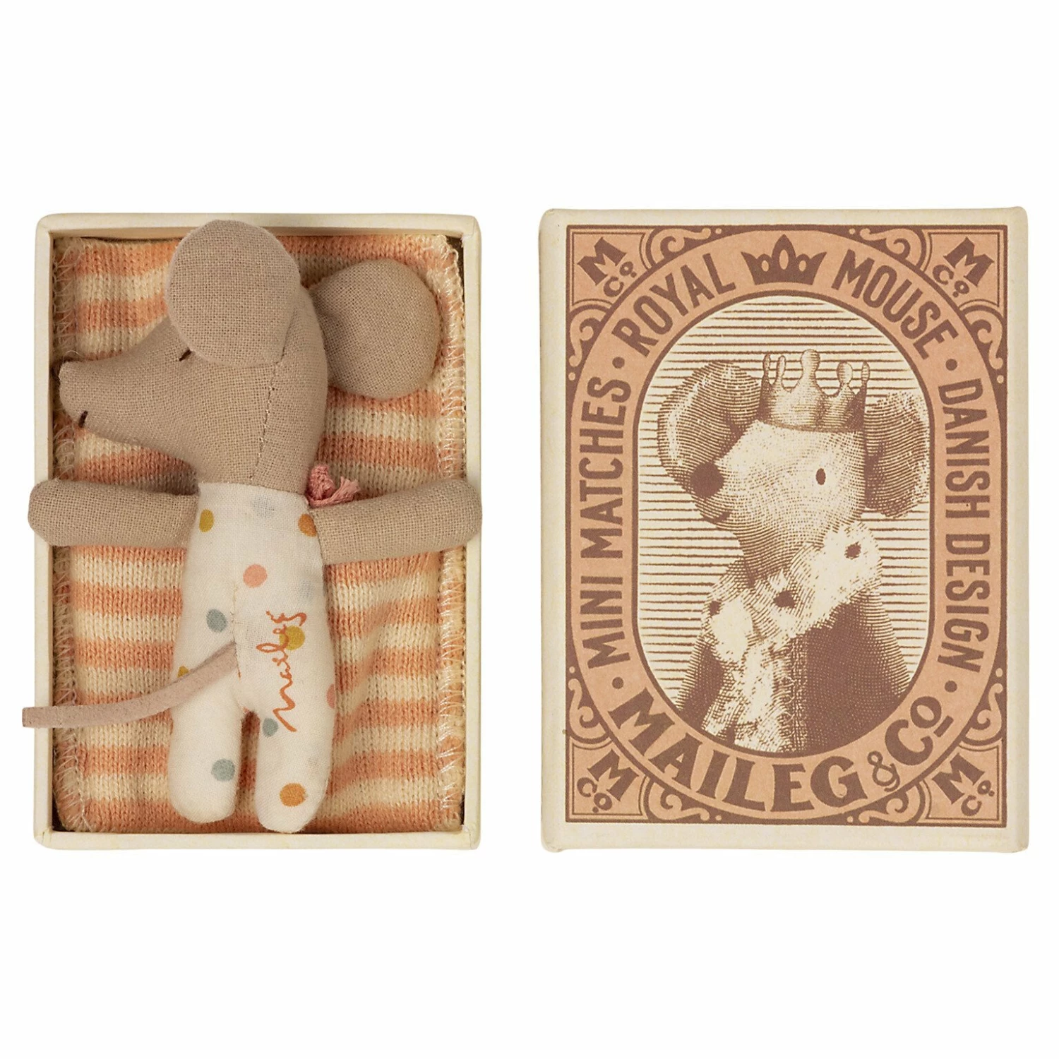 Sweet as can be. Sleepy Wakey Girl sleeps tight. The set comes with soft striped sleeping bag in a nicely decorated handmade matchbox. Size: Baby mouse Height: 8 cm Age: All ages Washing instruction: 30 degrees Material: Cotton