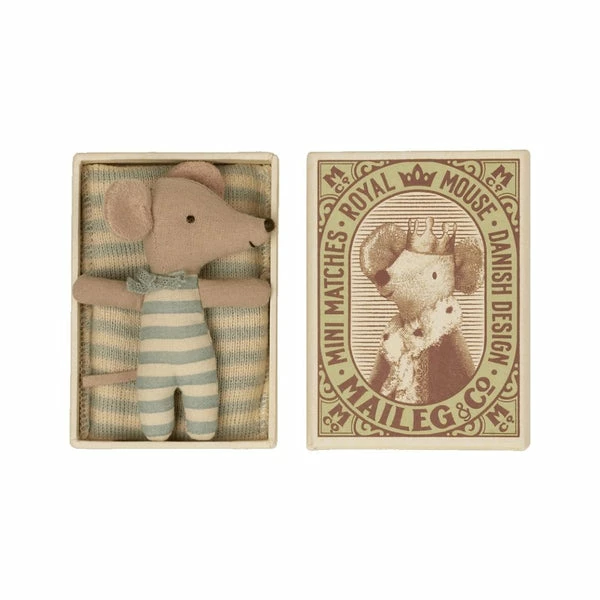 Maileg: Baby mouse – Sleepy/wakey – Boy New Style. A classic Maileg item. This mouse is ready for hours of play and sleeps tight in his little matchbox. The clothes and bed linen are made of soft fabrics with unique prints and beautiful colours.Size : BABYHeight : 8 cmAge: 0-3 YRWashing instruction: 30 CMaterial: COTTONSee the rest of the collection here.