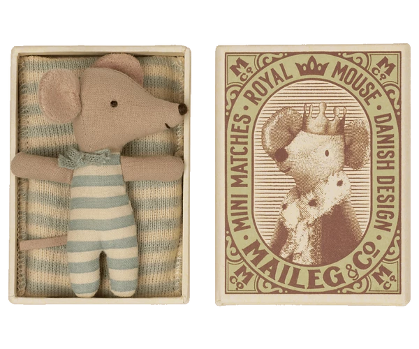 The adorable sleepy/wakey Maileg Baby Mouse Boy comes in his very own matchbox home and is the perfect friend for imaginative play. Turn him to one side and he is wide awake, turn him to the other side and he is fast asleep…shhhh. He is cute as can be, dressed in his sweet striped outfit complete with co-ordinating sleeping bag. Size: Baby Mouse Height: 8 cm Width: 2 cm Recommended Age group:+3 Year Wash: 30°C Material: Cotton Filling: Recycled polyester PLEASE NOTE: Fabrics may vary Your Maileg mouse will become a truly treasured toy. These beautiful mice are a mix of Scandinavian design and old fashioned nostalgia. The mice are made from cotton, linen and even have a leather tail. These timeless toys are ideal for handing down for the next generation to love.