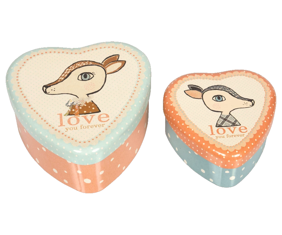A very sweet set of 2 heart shaped tins.They come as a set of two; both feature a cute deer with the words “Love You Forever”. The small one can also sit inside the large one. Product details Height: 5 cm Width: 11 cm Age: For decoration only Wash: Surface wash Material: Metal Maileg (pronounced My’lye) is a brand of charming Danish-designed toys created to inspire our children’s favourite playtime stories. By bringing storybook whimsy to everyday moments, Maileg toys help children explore the pure and simple wonder of imagination. Beloved for their heartwarming personalities, Maileg toys show playfulness and charm in every last detail. Theirs is a timeless world filled with beautiful accessories and settings to be collected, cherished and shared with friends and family for generations.