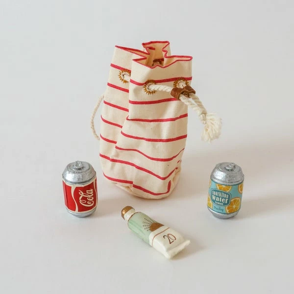 Vacation time. This small bag includes all must-have for a day in the sun: sunscreen and 2 sodas. All made in miniature size that fits the smallest Maileg friends. Please note that the sunscreen and soda cans can not be opened. Size: – Height: 7 cm Width: 7 cm Age: 3 YR + Wash: Surface wash Material: Cotton/Polyresin Filling: –