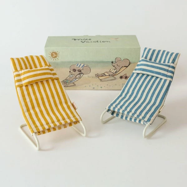 Vacation time. Bring these lovely striped beach chairs to the beach, and you will always have a perfect seat for your mice. Size: Mouse Height: 5 cm Width: 5 cm Age: 3 YR + Wash: Fabric 30°C Material: Metal/Cotton Filling: –