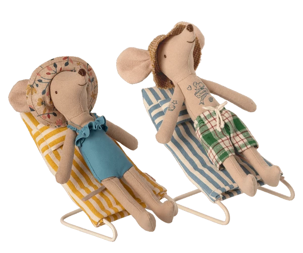 Size: Mouse Width: 5cm Height: 5cm Age: 3 years + Wash: fabric 40oc Vacation time. Bring these lovely striped beach chairs to the beach, and you will always have a perfect seat for your mice. Mice not included.