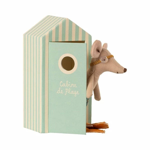 Maileg: Beach Mice – Big Brother in Cabin de Plage. Vacation time. This mouse is ready for a day at the beach, with the all needed accessories and a beautiful striped beach house. For more information on pre-orders please see our FAQs.Product detailsSize : Big sister / Big brother mouseHeight : 15,5 cmAge: All agesWashing instruction: 30 degreesMaterial: CottonSee the rest of the collection here.