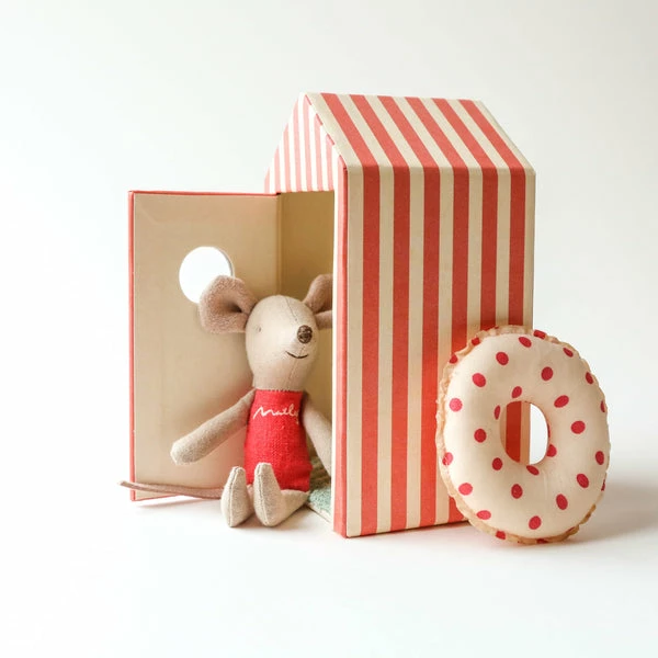 Vacation time. This mouse ia ready for a day at the beach, with all needed accessories and a beautiful striped beach house. Maileg is a brand of charming Danish-designed toys created to inspire our children’s favorite playtime stories. By bringing storybook whimsy to everyday moments, Maileg toys help children explore the pure and simple wonder of imagination. Beloved for their heartwarming personalities, Maileg toys show playfulness and charm in every last detail. Theirs is a timeless world filled with beautiful accessories and settings to be collected, cherished and shared with friends and family for generations. Size: Little sister/brother Height: 11 cm Age: All ages Wash: 30°C Material: Cotton/Linen Filling: Polyester/Pe Pellets