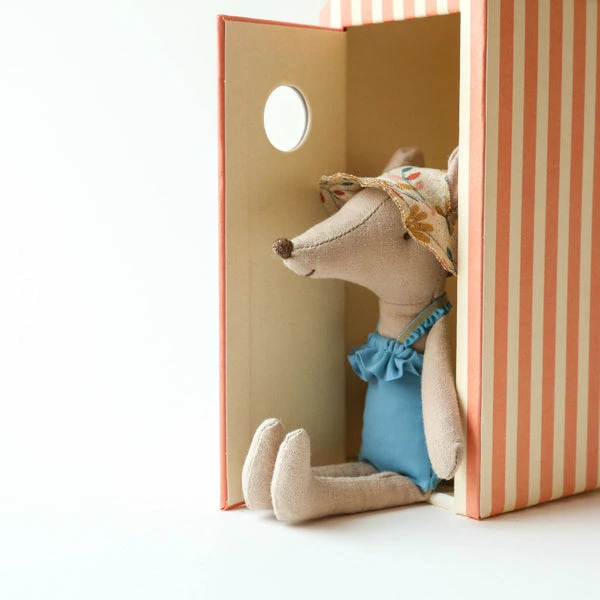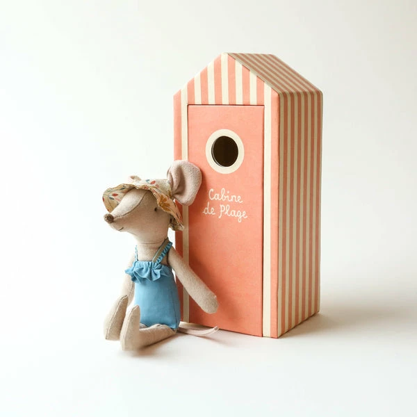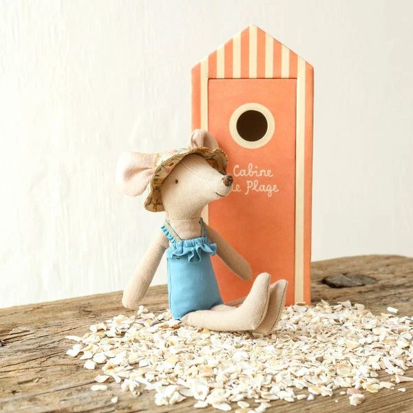 Vacation time. This mouse ia ready for a day at the beach, with all needed accessories and a beautiful striped beach house. Maileg is a brand of charming Danish-designed toys created to inspire our children’s favorite playtime stories. By bringing storybook whimsy to everyday moments, Maileg toys help children explore the pure and simple wonder of imagination. Beloved for their heartwarming personalities, Maileg toys show playfulness and charm in every last detail. Theirs is a timeless world filled with beautiful accessories and settings to be collected, cherished and shared with friends and family for generations. Size: Mother/Father mouse Height: 17 cm Width: 7 cm Age: All ages Wash: 30°C Material: Cotton Filling: Polyester/Pe Pellets