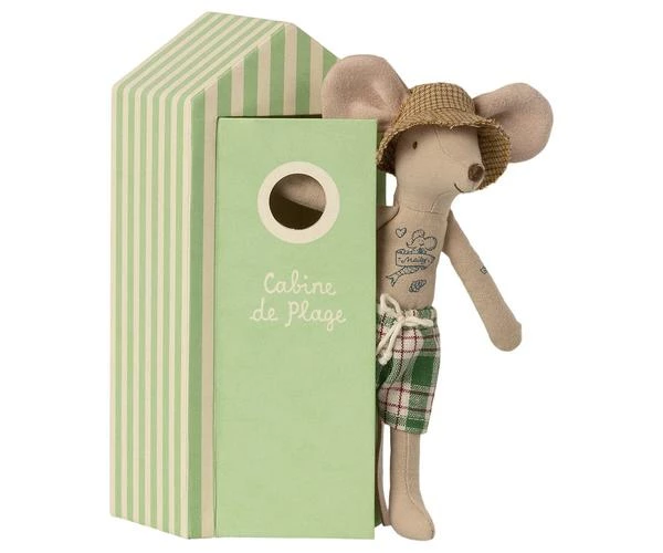 Size : Mother / Father mouse Height : 17,5 cm Age: All ages Washing instruction: 30 degrees Material: Cotton This mouse ia ready for a day at the beach, with all needed accessories and a beautiful striped beach house. By Maileg.