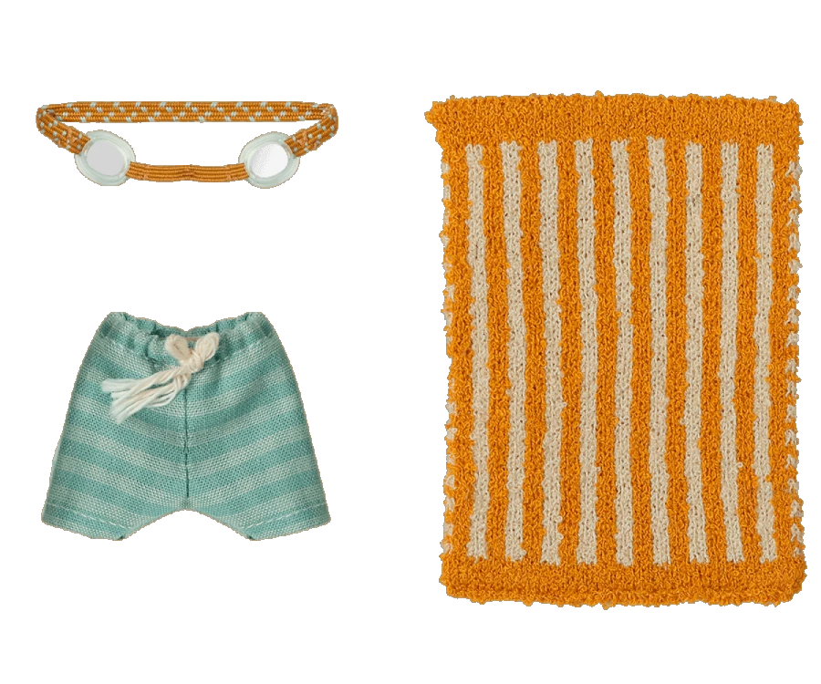 Vacation time. This set include all essential accessories for a fun day at the beach: trunks, goggles and a towel. It all fits the mice in size big brother/sister perfectly. Age: +3 Year Wash: 30°C Material: Cotton