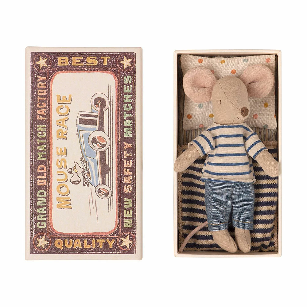 A classic Maileg item. This mouse is ready for hours of play and sleeps tight in a little matchbox. The clothes and bedlinen are made of soft fabrics with unique prints and beautiful colors.