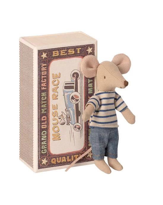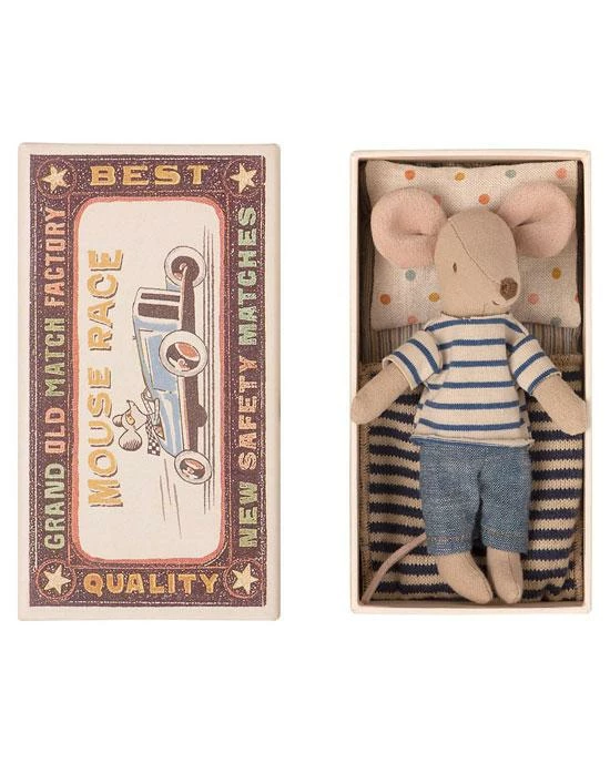 Maileg Big Brother Mouse wearing a striped cotton top and blue trousers within a stylish matchbox bed with knitted blanket, pillow and mattress. An ideal gift for Maileg Mice collectors and for fun imaginative role play. Size : Big sister / Big brother mouse Height : 13 cm Age: All ages Washing instruction: 30 degrees Material: Cotton / Linen About Maileg In a busy world of bright lights, bells and whistles, where new stories are continually impressed upon us… Maileg is a world in which matchboxes can be beds for mice; princesses make perfect teatime companions; and adventures can be found on a friendly forest walk. It is a world where cats and mice are friends. Ours is a world of childhood imagination – and this is a world we value. Maileg (pronounced My’lye) is a brand of charming Danish-designed toys created to inspire our children’s favorite playtime stories. By bringing storybook whimsy to everyday moments, Maileg toys help children explore the pure and simple wonder of imagination. Beloved for their heartwarming personalities, Maileg toys show playfulness and charm in every last detail. Theirs is a timeless world filled with beautiful accessories and settings to be collected, cherished and shared with friends and family for generations.