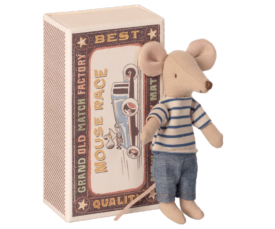 An adorable big brother mouse by Maileg. The mouse comes tucked away in a high quality box with his own bed, pillow and thick blanket. He gets a good rest at night to be bright and ready the next day, for lots of playing and fun. This is a unique gift that will be cherished for a long time to come. The mouse is 13cm approx and is made from cotton and linen.