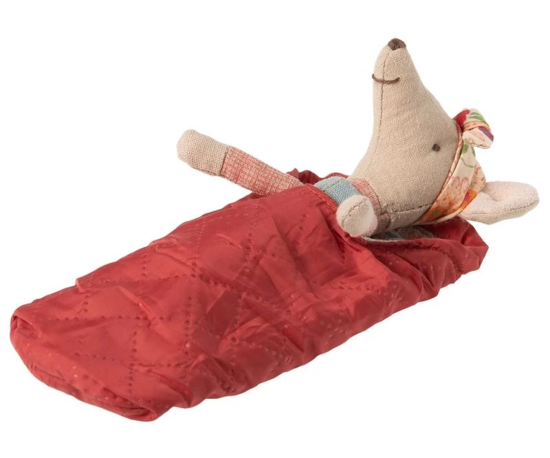 The little mouse is ready for the camping trip. She has protected her head with a bandana and on her back she carries her own sleeping bag, in which she can wrap herself warm in the evening. Size micro. Height: 12 cm, material: cotton. Age recommendation: 3+.