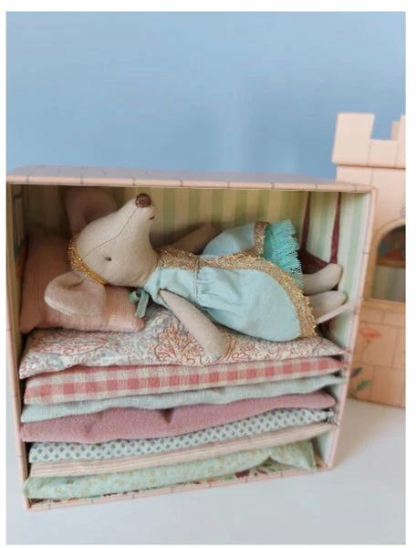 Once upon a time… Playset inspired by the famous fairy tale Princess and the pea. This set includes a paper castle with mattresses, a pea and a princess mouse. Size: BIG SISTER/BROTHER.