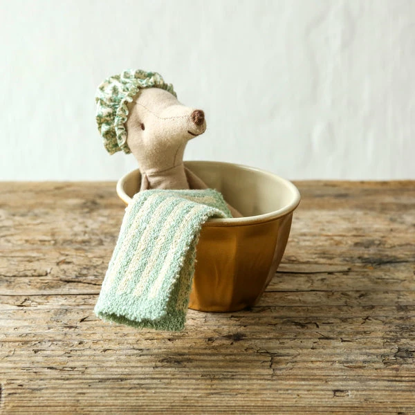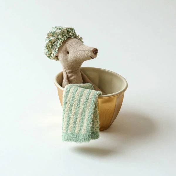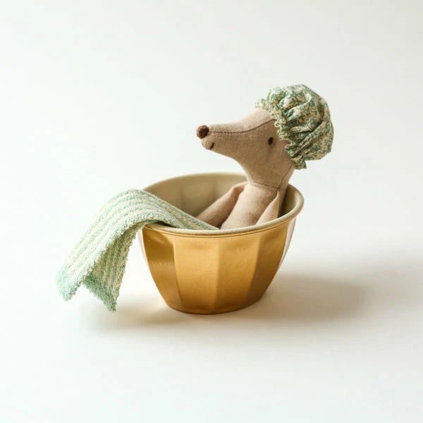 Like everyone else, this mouse loves to spend hours in the warm water in the spa. This playset contains a golden bathtub, a mouse, and a towel. Maileg is a brand of charming Danish-designed toys created to inspire our children’s favorite playtime stories. By bringing storybook whimsy to everyday moments, Maileg toys help children explore the pure and simple wonder of imagination. Beloved for their heartwarming personalities, Maileg toys show playfulness and charm in every last detail. Theirs is a timeless world filled with beautiful accessories and settings to be collected, cherished and shared with friends and family for generations. Size: Big sister/ brother Height: 9 cm Width: 7 cm Age: 3 YR + Wash: 30°C Material: Cotton Filling: Recycled polyester/Pe Pellets