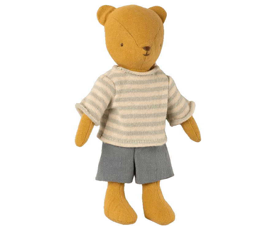 A beautiful set of clothes that fits the Teddy junior perfectly. This set includes a pair of pants and a soft knitted sweater. Product details Size : Teddy junior Height: 1cm Width: 9cm Age: 3 years + Washing instruction: 30 degrees Material: Cotton/Linen Maileg (pronounced My’lye) is a brand of charming Danish-designed toys created to inspire our children’s favourite playtime stories. By bringing storybook whimsy to everyday moments, Maileg toys help children explore the pure and simple wonder of imagination. Beloved for their heartwarming personalities, Maileg toys show playfulness and charm in every last detail. Theirs is a timeless world filled with beautiful accessories and settings to be collected, cherished and shared with friends and family for generations.