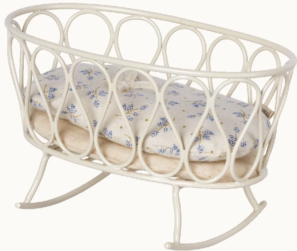 The cradle has rounded feet, so you can easily rock your, small soft friends, into sleep. Height : 9 cm Age: 3 years & up. Material: Metal / Cotton.