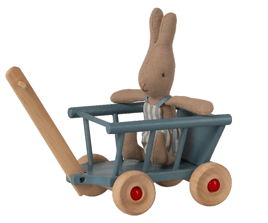 A small wagon is always needed – either to carry your best friend or the groceries. This little wagon is made in wood and painted in a bright blue colour. Product details Height: 5 cm Width: 11 cm Age: 3 YR + Wash: Surface Wash Material: FSC Wood Maileg (pronounced My’lye) is a brand of charming Danish-designed toys created to inspire our children’s favourite playtime stories. By bringing storybook whimsy to everyday moments, Maileg toys help children explore the pure and simple wonder of imagination. Beloved for their heartwarming personalities, Maileg toys show playfulness and charm in every last detail. Theirs is a timeless world filled with beautiful accessories and settings to be collected, cherished and shared with friends and family for generations.