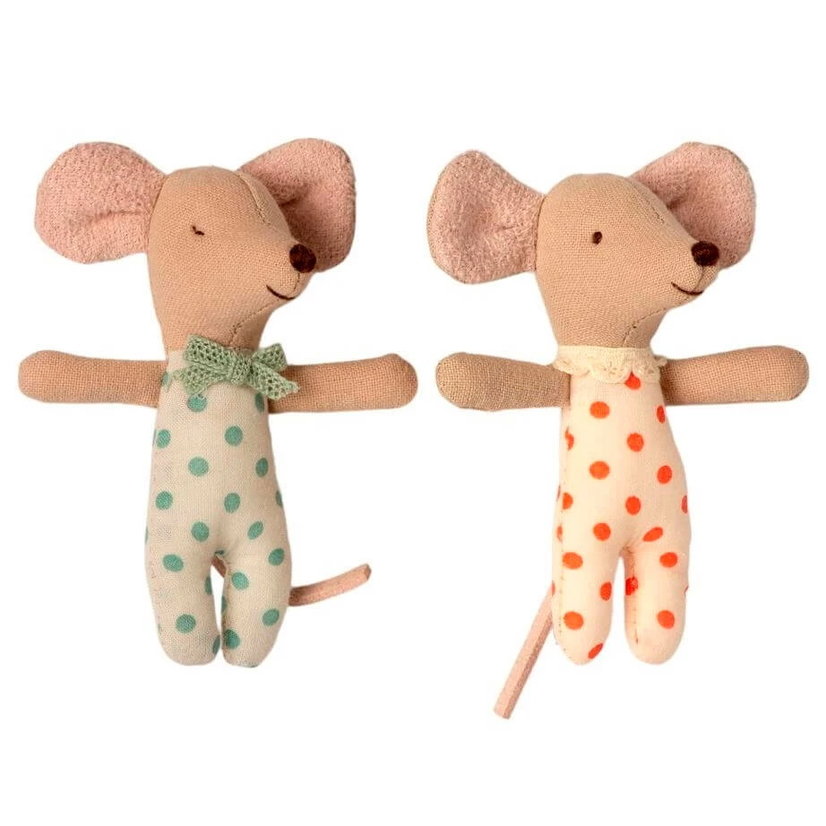 Maileg’s adorable baby twins sleep in their matchbox bed with a beautiful blue blanket and light patterned flowers. A baby mouse is awake while her baby boy sleeps. Baby mice are 8 cm tall. A lovely gift for our boys and girls to have fun playing and caring for.