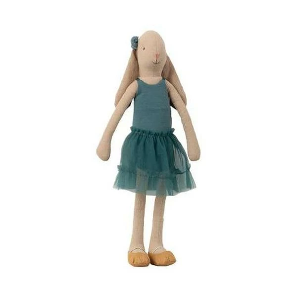 Size 3, Medium, 42cm Age 3+ A beautifully designed bunny by Maileg of Denmark, in a petrol tutu and gold ballet shoes.