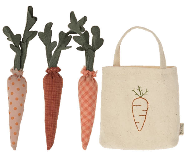 The favourite snack of rabbits & bunnies. This little bag contains three carrots and is all in Maileg fabric. A sweet accessory that will encourage even more play. Height: 14cm Width: 8cm Wash: 30 degrees Materials: Cotton