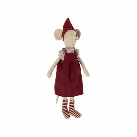 A cosy mouse dressed in Christmas clothes ready to celebrate the wonderful days of Christmas. festive outfit comprising of a linen blouse with red spots, red cotton dress and stripey socks topped off with a red pixy hat. This mouse will bring Christmas cheer. H 33cm (exc hat), 37cm (inc hat) Suitable From Birth