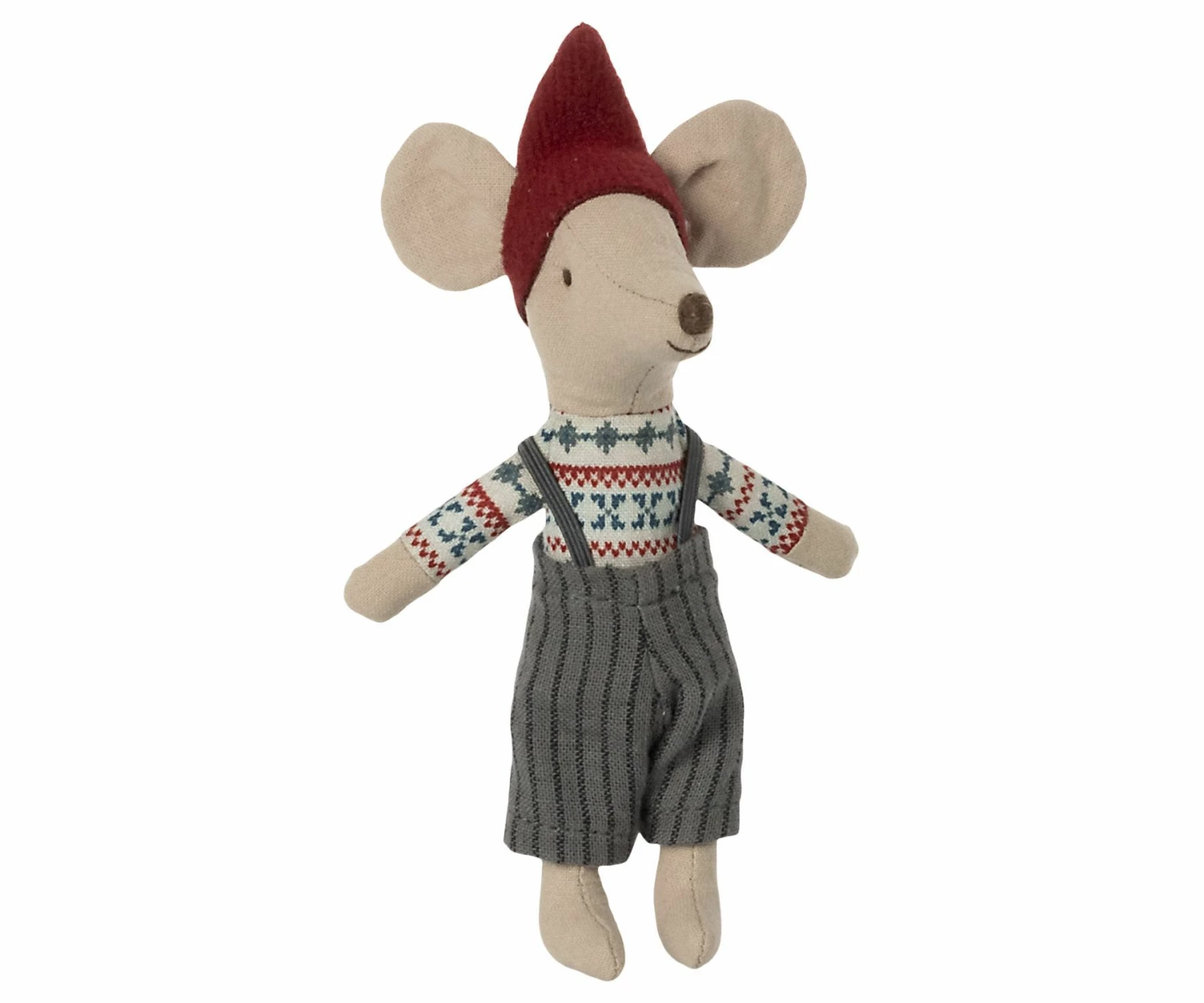 The perfect festive companion, this Big Brother mouse is ready to enjoy all the best seasonal activities right by your side. Carol singing, gingerbread house making- you name it, he can do it. All cosy in his Christmas attire, after a long day of festive fun this little mouse can cuddle up in his little matchbox bed. Pull the covers over him and give his nose a little kiss before he sleeps and dreams of tomorrows adventures. Not suitable for children under 36mths. Materials- cotton, polyester, PE pellets, cardboard (matchbox) Fabric items washable at 30º.