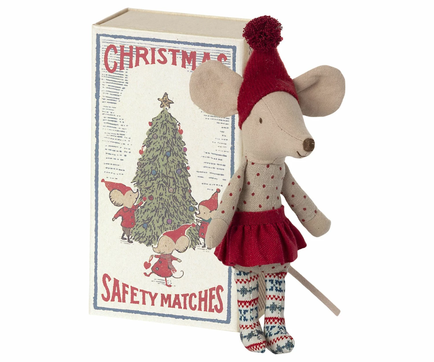 The perfect festive companion, this Big Sister mouse is ready to enjoy all the best seasonal activities right by your side. Carol singing, gingerbread house making- you name it, she can do it. All cosy in her Christmas attire, after a long day of festive fun this little mouse can cuddle up in her little matchbox bed. Pull the covers over her and give her nose a little kiss before she sleeps and dreams of tomorrows adventures. Not suitable for children under 36mths. Materials- cotton, polyester, PE pellets, cardboard (matchbox) Fabric items washable at 30º.