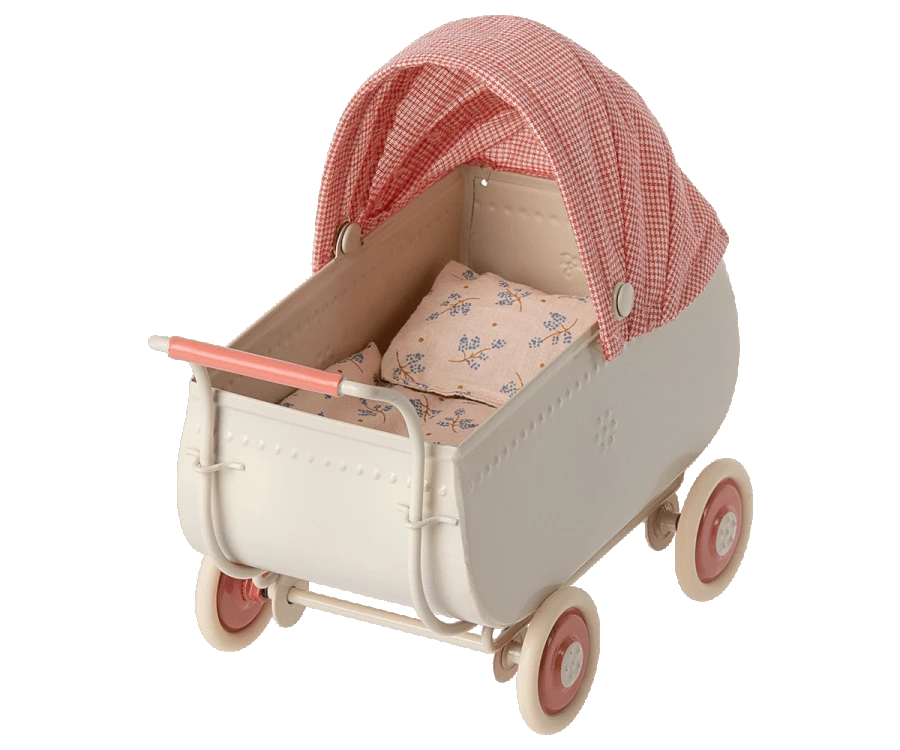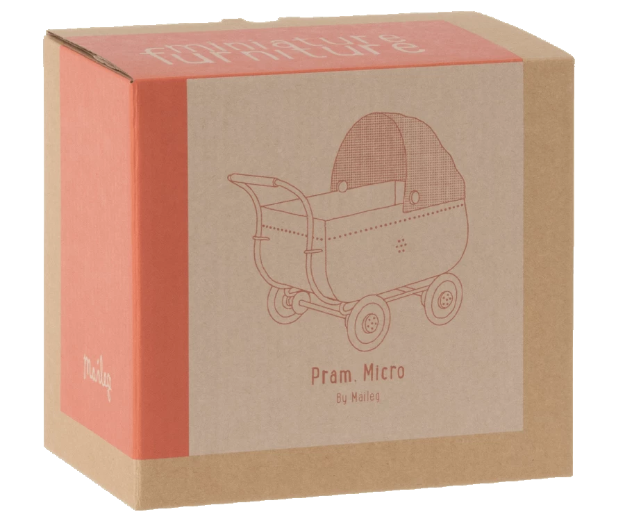A beautiful Maileg pram with an exclusive vintage look. The metal part has embossed details on the sides, and the fabric cover fulfils the look. The pram is perfect for a walk when the baby sleeps. Product details Size: Micro Height: 15 cm Width: 10 cm Age: 3 YR + Wash: Surface wash Material: Metal / Plastic / Cotton Filling: Recycled polyester Maileg (pronounced My’lye) is a brand of charming Danish-designed toys created to inspire our children’s favourite playtime stories. By bringing storybook whimsy to everyday moments, Maileg toys help children explore the pure and simple wonder of imagination. Beloved for their heartwarming personalities, Maileg toys show playfulness and charm in every last detail. Theirs is a timeless world filled with beautiful accessories and settings to be collected, cherished and shared with friends and family for generations.