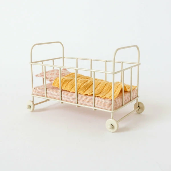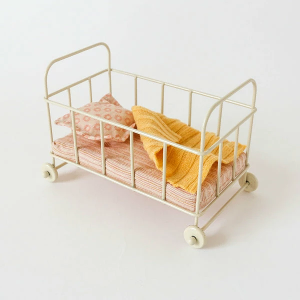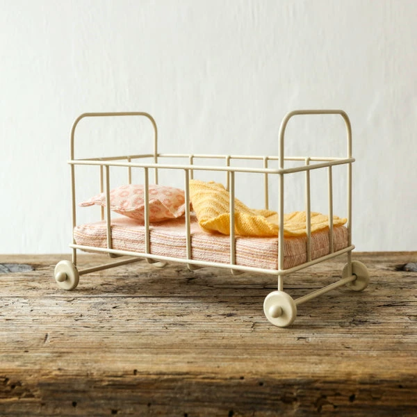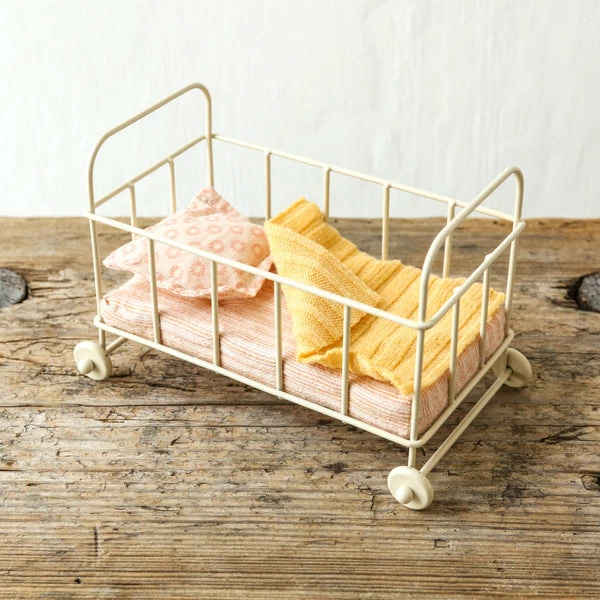 A cosy cot bed made of metal, it comes with a mattress, blanket, and pillow. You can tuck in your micro sized friends as well as the small mice Maileg is a brand of charming Danish-designed toys created to inspire our children’s favorite playtime stories. By bringing storybook whimsy to everyday moments, Maileg toys help children explore the pure and simple wonder of imagination. Beloved for their heartwarming personalities, Maileg toys show playfulness and charm in every last detail. Theirs is a timeless world filled with beautiful accessories and settings to be collected, cherished and shared with friends and family for generations. Size: Micro Height: 10 cm Width: 16 cm Age: +3 Year Wash: Surface wash Material: Metal/Cotton Filling: Polyester