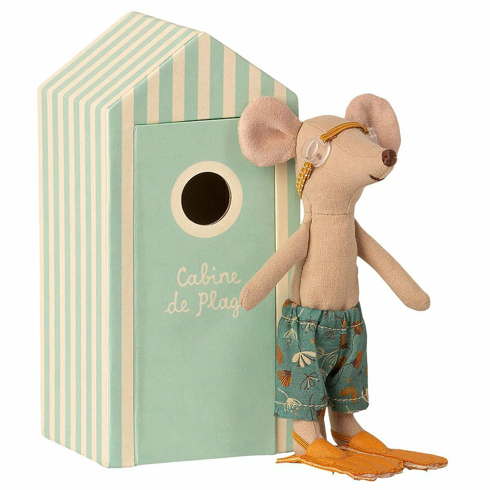 Cette souris est prête pour une journée à la plage, avec tous les accessoires nécessaires et une belle maison de plage à rayures.