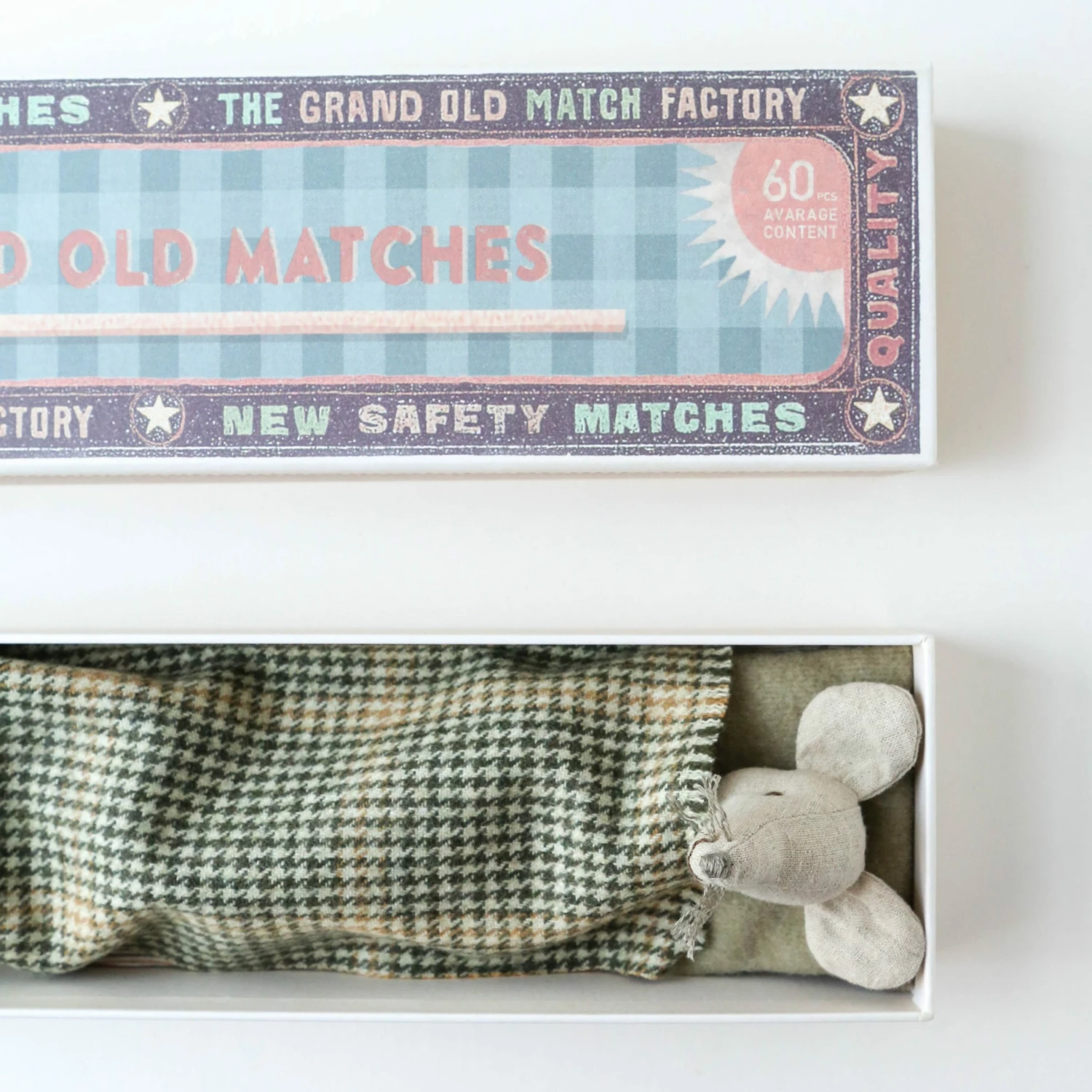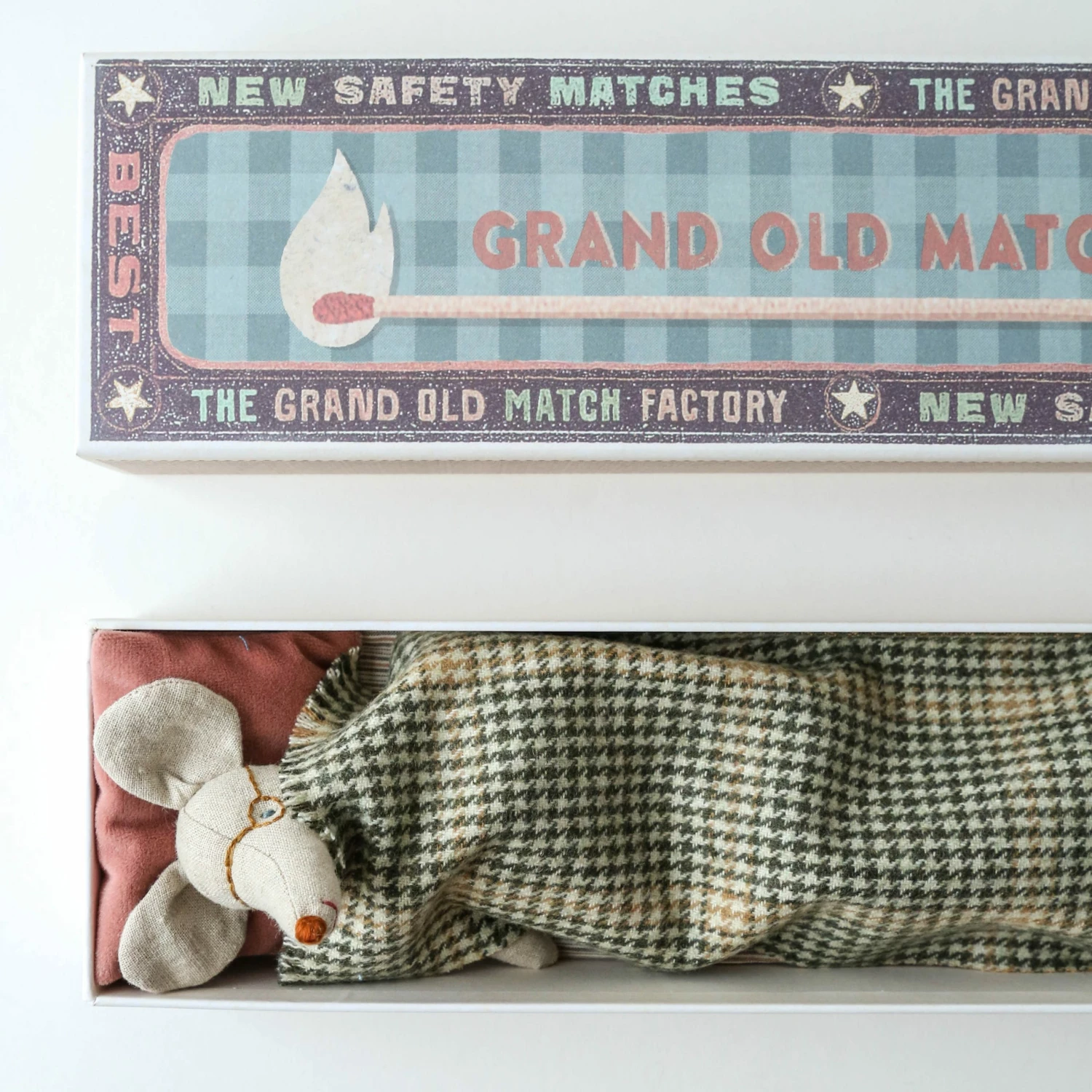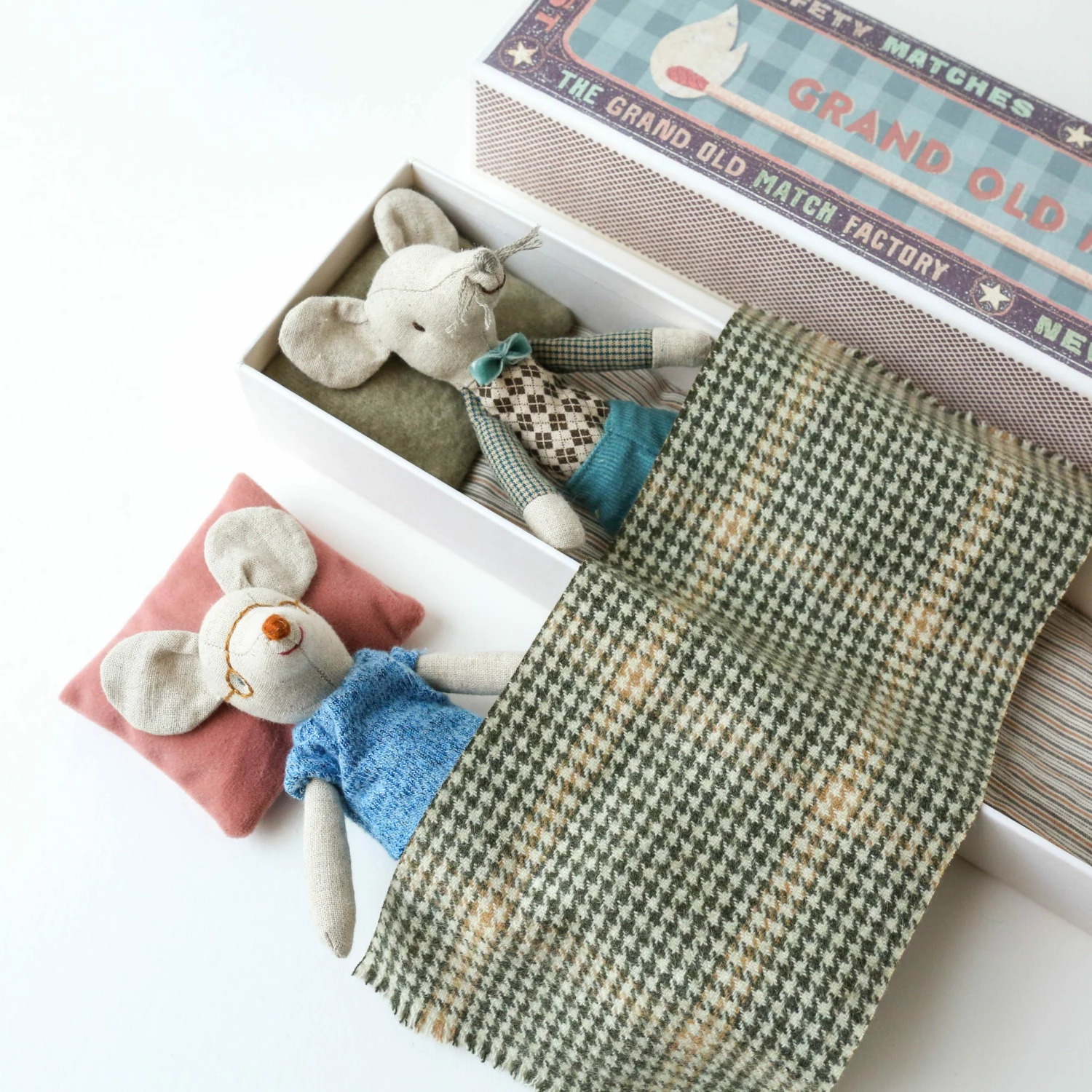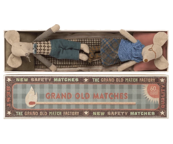 We all love our mum and dad, but everyone knows it is grandma and grandpa who really love to spoil the kids! Grandma and grandpa mouse come in their grand old matchbox that is furnished with a mattress, pillow, and blanket. Size: Mother/Father mouse Height: 17 cm Age: All ages Wash: 30°C Material: Cotton/Linen Filling: Recycled polyester/Pe Pellets