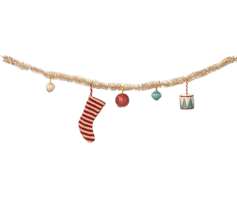 Décorez pour Noël votre maison miniature avec cette guirlande à paillettes. De petits ornements, un tambour en bois et un bas doux sont ajoutés pour donner un look confortable et créer une véritable atmosphère de Noël.