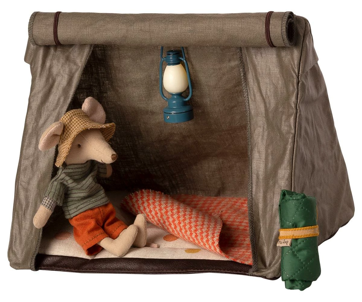 Leve os ratinhos para acampar em uma noite estrelada! Traz uma manta para manter os amigos quentinhos durante a noite. O tecido da tenda tem um acabamento revestido para um ar mais realístico.