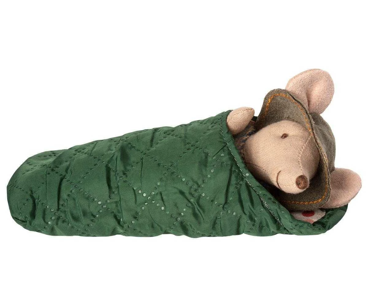 Mouse hiking, big brother Maileg. Ain’t no mountain high enough. Hiker boy will spend days in the wilderness with her sleeping bag, blue dress and fashionable bandana Height : 12 cm. Washing instruction: 30 degree c. Material: Cotton/Linen.