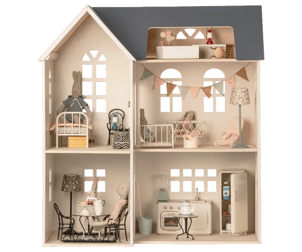 This wonderful wooden dollhouse is the perfect gift for a little Maileg fan – perfect for mice, bunnies and all your Maileg friends. It has two floors and an attic. The house comes empty so it is perfect for you to furnish it your favourite Maileg furniture. Comes flat packed and is easy to assemble. Assembled size 80x40x72 cm Comes without furniture. Recommended Age group: +3 Year Wash: Surface wash Material: FSC Wood Maileg is a Danish toy brand founded in 1999 by illustrator Dorthe Mailil. They are known for their delightful and imaginative toy designs ranging from mice in matchboxes to giant bunnies, along with all the accessories and clothing o dress up her creations. Her unique touch and expression offer a distinctive look which children have grown to adore. Suitable for all ages, Maileg mice are made from natural materials and to a very high standard, so make great keepsakes and are perfect to hand down to siblings