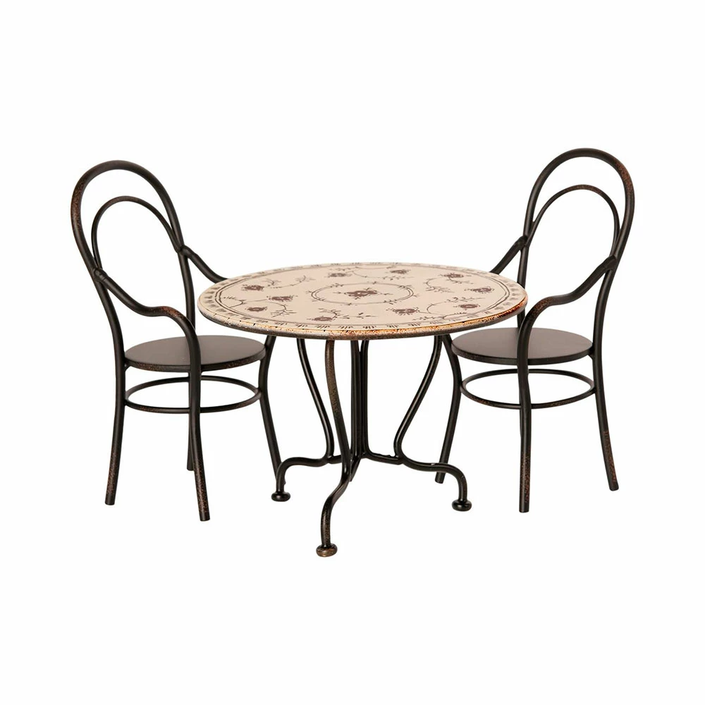 Invita a tu amiguito a la cena del domingo en la mesa del comedor. Este set contiene una mesa redonda y 2 sillas de metal.