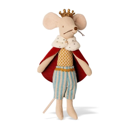 Designed by award-winning Danish company Maileg, King Mouse is a new addition to a very special and completely irresistible family of mice. His Royal Highness is a thoroughly modern monarch, dressed for the palace ball in blue striped trousers, patterned gold top and fur-trimmed red cape, all topped off with a beautiful knitted golden crown. The King is more than ready to take centre stage for late-night dancing at the palace. This smaller sized Maileg mouse is incredibly sweet and petite enough to pop in your bag or pocket.