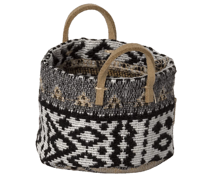 Wer das Zuhause für seine kleinen Spielgefährten im Bohemian Style ausstatten möchte kommt an diesem originellen Accessoire nicht vorbei. Der winzige Korb ist eine erwachsenengetreue Nachbildung aus Webstoff mit schwarz weißem Aztekenmuster und Henkeln aus Kunstleder. Außer für die Ausstattung deines trendigen Puppenheims kannst du ihn auch gut als originelle Verpackung für ein kleines Geschenk verwenden. Abmessung: H 4 B 3 cm Material: Baumwolle Polyester Farbe: Schwarz Natur.