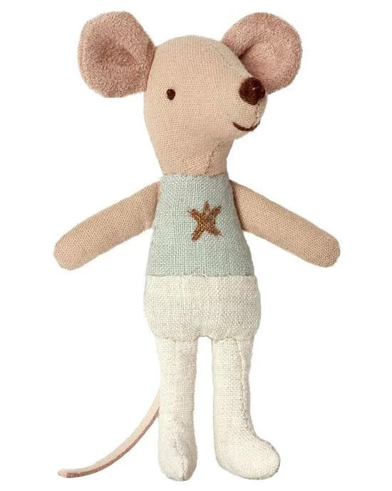 Little brother mouse with star vest in a matchbox by Maileg. Little brother mouse is wearing a smart star vest and white trousers. He comes complete with blue blanket and spotty pillow. Mouse 10cm tall. Matchbox 11cm x 8cm x 5cm. Made from Cotton and Linen. Wash at 30 degrees Celsius. About Maileg In a busy world of bright lights, bells and whistles, where new stories are continually impressed upon us… Maileg is a world in which matchboxes can be beds for mice; princesses make perfect teatime companions; and adventures can be found on a friendly forest walk. It is a world where cats and mice are friends. Ours is a world of childhood imagination – and this is a world we value. Maileg (pronounced My’lye) is a brand of charming Danish-designed toys created to inspire our children’s favorite playtime stories. By bringing storybook whimsy to everyday moments, Maileg toys help children explore the pure and simple wonder of imagination. Beloved for their heartwarming personalities, Maileg toys show playfulness and charm in every last detail. Theirs is a timeless world filled with beautiful accessories and settings to be collected, cherished and shared with friends and family for generations.