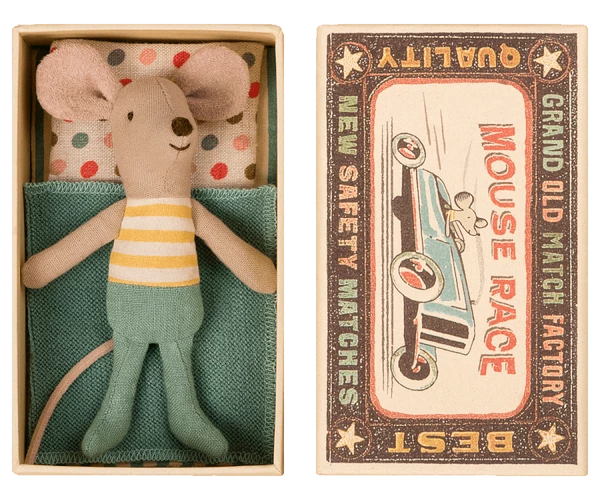 Just look at this cute little brother mouse, with delightful details from his nose to his tail. He lives in his matchbox and sleeps on cute teal bedding. His ears are fuzzy and soft, and he is dressed in a yellow striped tee shirt and teal pants. ( Fabrics may vary) Size: Little Sister/ Brother Height: 10 cm Recommended age group: All ages Wash: 30°C Material: Cotton-Polyester Your Maileg mouse will become a truly treasured toy. These beautiful mice are a mix of Scandinavian design and old fashioned nostalgia. The mice are made from cotton, linen and even have a leather tail. These timeless toys are ideal for handing down for the next generation to love.
