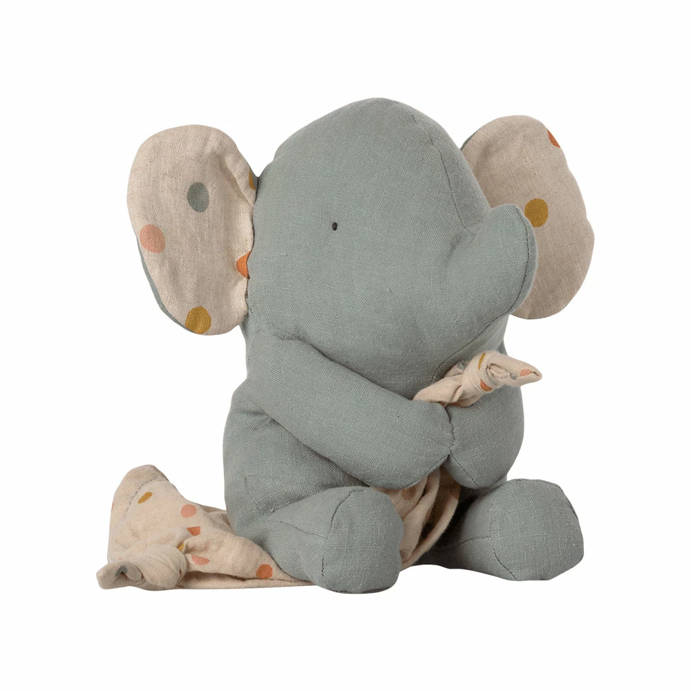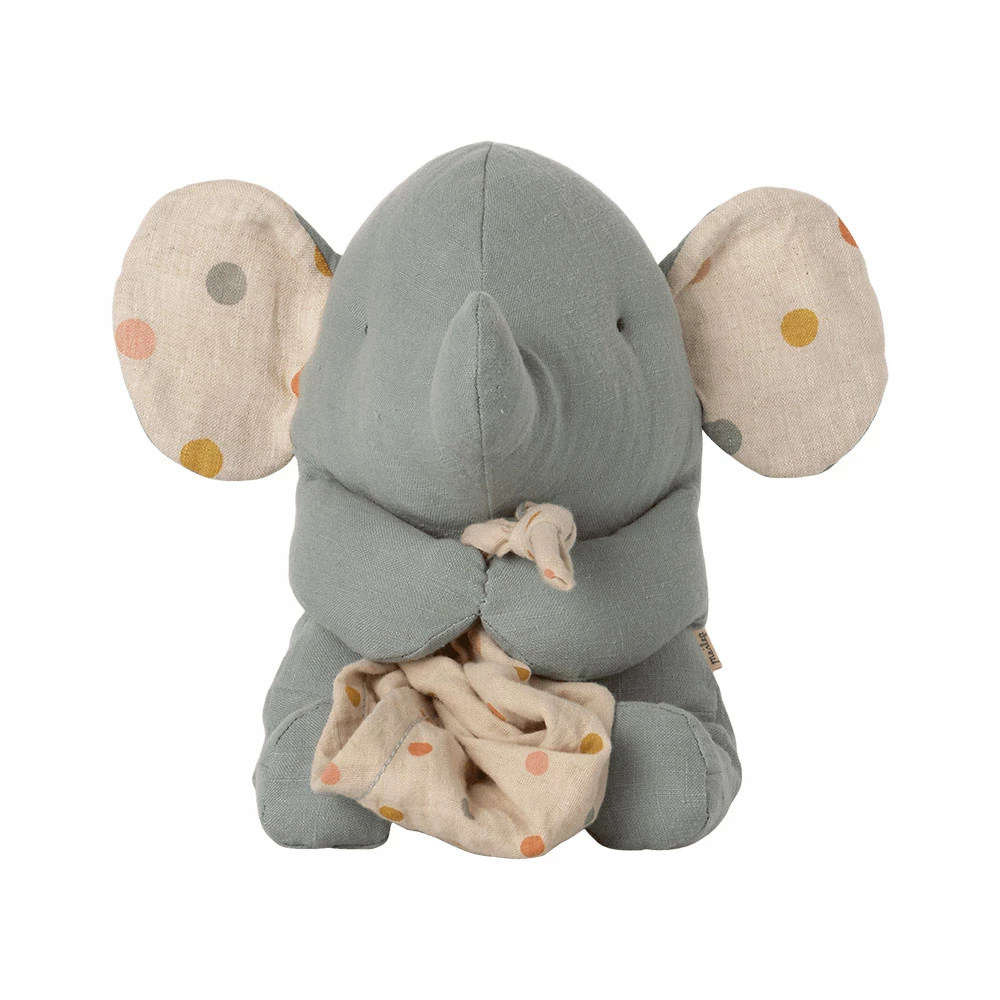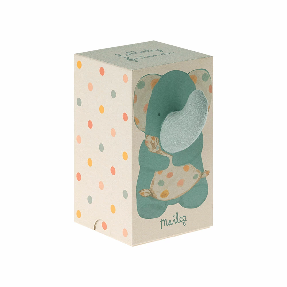 Este elefante tiene un paño suave y toca una canción de cuna tranquila cuando tiras de la cola. Está hecho de telas suaves con un bonito estampado y está empaquetado en una hermosa caja de regalo.