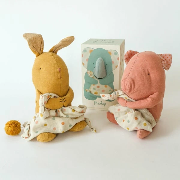 Lullaby friends is a collection with beautiful items for babies. Each animal has a soft cuddle cloth and will play a calm lullaby when you pull the tail. It is made in soft fabrics with unique prints and is packed in a beautiful giftbox. Maileg is a brand of charming Danish-designed toys created to inspire our children’s favorite playtime stories. By bringing storybook whimsy to everyday moments, Maileg toys help children explore the pure and simple wonder of imagination. Beloved for their heartwarming personalities, Maileg toys show playfulness and charm in every last detail. Theirs is a timeless world filled with beautiful accessories and settings to be collected, cherished and shared with friends and family for generations. All ages Height: 32cm Materials: Cotton/Linen Filling: Recycled Polyester / Pe Pellets Wash at 30°C
