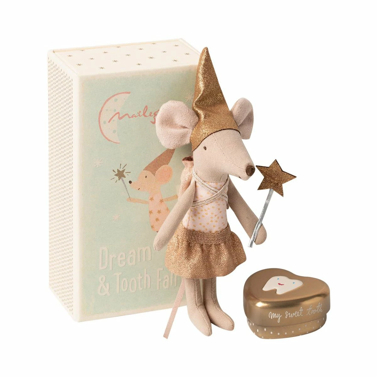 At night the tooth fairy spreads fairy dust, collects teeth, brings treats, and makes sure you have sweet dreams. Dressed magically in a gold tutu, a shiny hat, and a sparkly backpack – includes matchbox. Size: Big sister / Big brother mouse Height: 13 cm Age: All ages Washing instruction: 30 degrees Material: Cotton