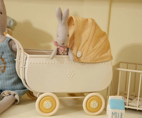A beautiful Maileg pram with an exclusive vintage look. The metal part has embossed details on the sides, and the fabric cover fulfills the look. The pram is perfect for a walk when the baby sleeps. Size: Micro Height: 15cm Width: 10cm Wash: Surface Wash Materials: Metal/Plastic/Cotton Age: 3+