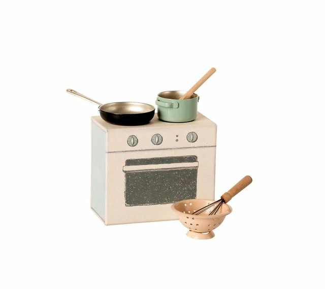 Mini cardboard kitchen supplied with a pack of utensils.